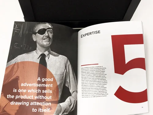This is a promotional piece book for the worldwide advertising agency Ogilvy & Mather. It highlights their company, clients, and the history of the man whose beliefs still drive the agency today. Together, it’s paired with a briefcase inspired encasement in honor of both the Ogilvy the gentleman and traveling salesman.